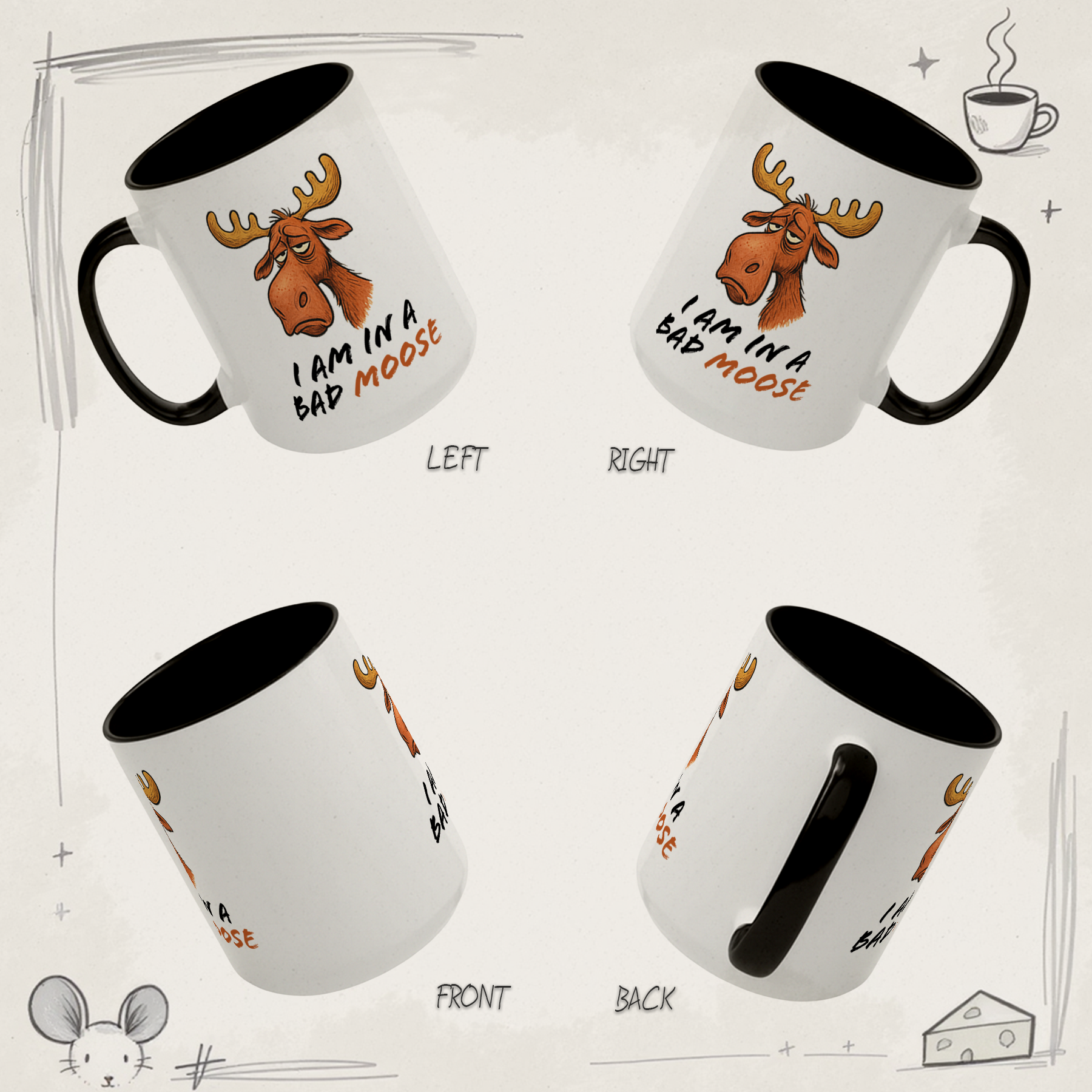 A hilariously unimpressed moose stares with heavy eyelids while the hand-lettered line below reads I AM IN A BAD MOOSE—cheeky pun fully intended. Warm browns and sketchy fur details make the character feel alive, turning your morning mug into a mood update that gets laughs before the first sip.